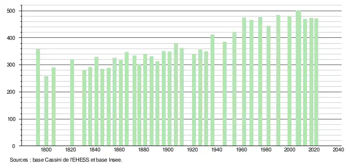 L'évolution du nombre d'habitants est connue à travers les recensements de la population effectués dans la commune depuis 1793. Pour les communes de moins de 10 000 habitants, une enquête de recensement portant sur toute la population est réalisée tous les cinq ans, les populations légales des années intermédiaires étant quant à elles estimées par interpolation ou extrapolation[22]. Pour la commune, le premier recensement exhaustif entrant dans le cadre du nouveau dispositif a été réalisé en 2007[23].