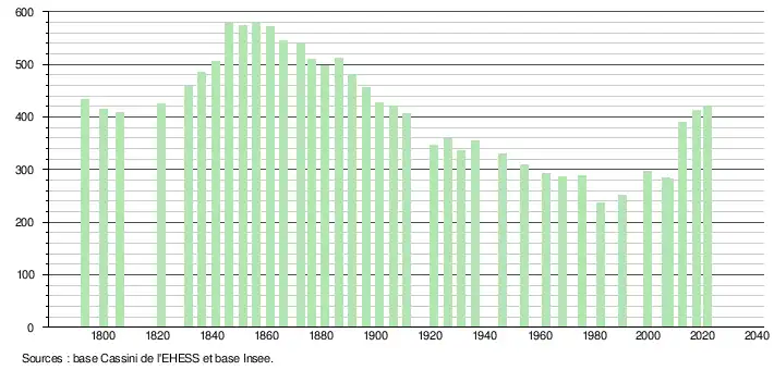 L'évolution du nombre d'habitants est connue à travers les recensements de la population effectués dans la commune depuis 1793. Pour les communes de moins de 10 000 habitants, une enquête de recensement portant sur toute la population est réalisée tous les cinq ans, les populations légales des années intermédiaires étant quant à elles estimées par interpolation ou extrapolation[15]. Pour la commune, le premier recensement exhaustif entrant dans le cadre du nouveau dispositif a été réalisé en 2007[16].