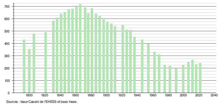 L'évolution du nombre d'habitants est connue à travers les recensements de la population effectués dans la commune depuis 1793. Pour les communes de moins de 10 000 habitants, une enquête de recensement portant sur toute la population est réalisée tous les cinq ans, les populations légales des années intermédiaires étant quant à elles estimées par interpolation ou extrapolation[38]. Pour la commune, le premier recensement exhaustif entrant dans le cadre du nouveau dispositif a été réalisé en 2006[39].