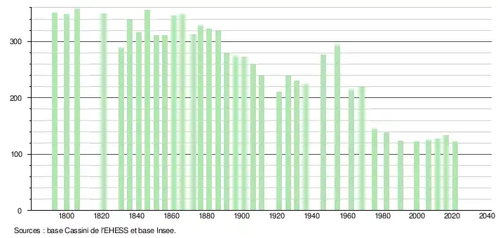 L'évolution du nombre d'habitants est connue à travers les recensements de la population effectués dans la commune depuis 1793. Pour les communes de moins de 10 000 habitants, une enquête de recensement portant sur toute la population est réalisée tous les cinq ans, les populations légales des années intermédiaires étant quant à elles estimées par interpolation ou extrapolation[26]. Pour la commune, le premier recensement exhaustif entrant dans le cadre du nouveau dispositif a été réalisé en 2006[27].