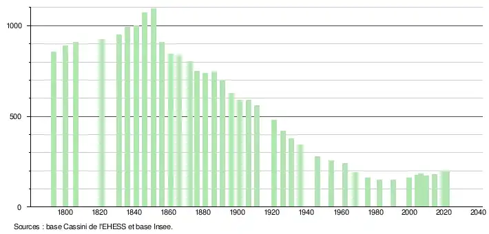| L'évolution du nombre d'habitants est connue à travers les recensements de la population effectués dans la commune depuis 1793. Pour les communes de moins de 10 000 habitants, une enquête de recensement portant sur toute la population est réalisée tous les cinq ans, les populations légales des années intermédiaires étant quant à elles estimées par interpolation ou extrapolation[38]. Pour la commune, le premier recensement exhaustif entrant dans le cadre du nouveau dispositif a été réalisé en 2004[39]. En 2021, la commune comptait 194 habitants[Note 7], en augmentation de 9,6 % par rapport à 2015 (Lozère : +0,28 %, France hors Mayotte : +1,84 %). |