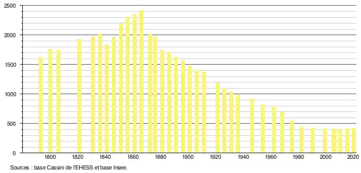 En 2020, la commune comptait 416 habitants[Note 2], en augmentation de 0,73 % par rapport à 2014 (Mayenne : −0,65 %, France hors Mayotte : +1,84 %).