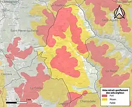 Le retrait-gonflement des sols argileux est susceptible d'engendrer des dommages importants aux bâtiments en cas d’alternance de périodes de sécheresse et de pluie. 84 % de la superficie communale est en aléa moyen ou fort (54,2 % au niveau départemental et 48,5 % au niveau national). Sur les 239 bâtiments dénombrés sur la commune en 2019, 235 sont en aléa moyen ou fort, soit 98 %, à comparer aux 57 % au niveau départemental et 54 % au niveau national. Une cartographie de l'exposition du territoire national au retrait gonflement des sols argileux est disponible sur le site du BRGM[17],[Carte 2].