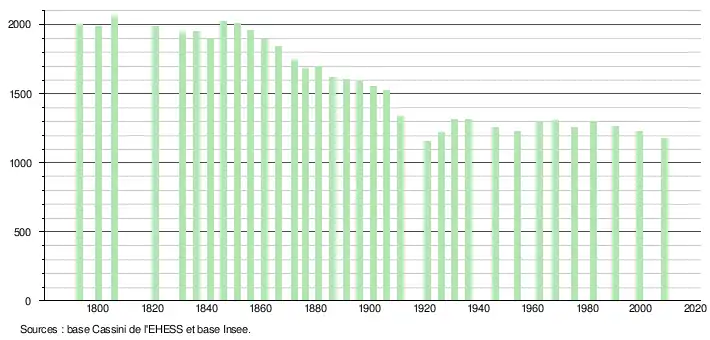 L'évolution du nombre d'habitants est connue à travers les recensements de la population effectués dans la commune depuis 1793. À partir du , les populations légales des communes sont publiées annuellement dans le cadre d'un recensement qui repose désormais sur une collecte d'information annuelle, concernant successivement tous les territoires communaux au cours d'une période de cinq ans. Pour les communes de moins de 10 000 habitants, une enquête de recensement portant sur toute la population est réalisée tous les cinq ans, les populations légales des années intermédiaires étant quant à elles estimées par interpolation ou extrapolation[9]. Pour la commune, le premier recensement exhaustif entrant dans le cadre du nouveau dispositif a été réalisé en 2008[10],[Note 2].