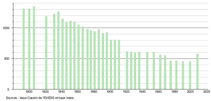 - Dans le tableau des recensements et le graphique, par convention dans Wikipédia, le principe a été retenu, pour les populations légales postérieures à 1999 de n’afficher dans le tableau des recensements et le graphique que les populations correspondant à l'année 2006, première population légale publiée calculée conformément aux concepts définis dans le décret no 2003-485 du 5 juin 2003, et les années correspondant à une enquête exhaustive de recensement pour les communes de moins de 10 000 habitants, ainsi que la dernière population légale publiée par l’Insee.