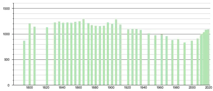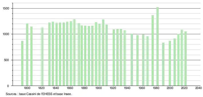 L'évolution du nombre d'habitants est connue à travers les recensements de la population effectués dans la commune depuis 1793. Pour les communes de moins de 10 000 habitants, une enquête de recensement portant sur toute la population est réalisée tous les cinq ans, les populations légales des années intermédiaires étant quant à elles estimées par interpolation ou extrapolation[26]. Pour la commune, le premier recensement exhaustif entrant dans le cadre du nouveau dispositif a été réalisé en 2006[27].