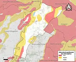 Les mouvements de terrains susceptibles de se produire sur la commune sont des tassements différentiels[19]. Le retrait-gonflement des sols argileux est susceptible d'engendrer des dommages importants aux bâtiments en cas d’alternance de périodes de sécheresse et de pluie[20]. 46 % de la superficie communale est en aléa moyen ou fort (54,9 % au niveau départemental et 48,5 % au niveau national)[Carte 2]. Depuis le , en application de la loi ELAN, différentes contraintes s'imposent aux vendeurs, maîtres d'ouvrages ou constructeurs de biens situés dans une zone classée en aléa moyen ou fort[Note 3],[21].