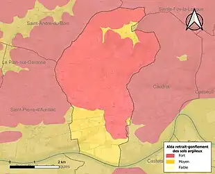 Le retrait-gonflement des sols argileux est susceptible d'engendrer des dommages importants aux bâtiments en cas d’alternance de périodes de sécheresse et de pluie. La totalité de la commune est en aléa moyen ou fort (67,4 % au niveau départemental et 48,5 % au niveau national). Sur les 266 bâtiments dénombrés sur la commune en 2019, 266 sont en aléa moyen ou fort, soit 100 %, à comparer aux 84 % au niveau départemental et 54 % au niveau national. Une cartographie de l'exposition du territoire national au retrait gonflement des sols argileux est disponible sur le site du BRGM[23],[Carte 2].