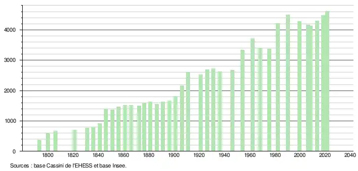 L'évolution du nombre d'habitants est connue à travers les recensements de la population effectués dans la commune depuis 1793. Pour les communes de moins de 10 000 habitants, une enquête de recensement portant sur toute la population est réalisée tous les cinq ans, les populations légales des années intermédiaires étant quant à elles estimées par interpolation ou extrapolation[27]. Pour la commune, le premier recensement exhaustif entrant dans le cadre du nouveau dispositif a été réalisé en 2008[28].