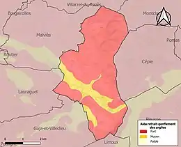 Le retrait-gonflement des sols argileux est susceptible d'engendrer des dommages importants aux bâtiments en cas d’alternance de périodes de sécheresse et de pluie. La totalité de la commune est en aléa moyen ou fort (75,2 % au niveau départemental et 48,5 % au niveau national). Sur les 196 bâtiments dénombrés sur la commune en 2019, 196 sont en aléa moyen ou fort, soit 100 %, à comparer aux 94 % au niveau départemental et 54 % au niveau national. Une cartographie de l'exposition du territoire national au retrait gonflement des sols argileux est disponible sur le site du BRGM[25],[Carte 3].