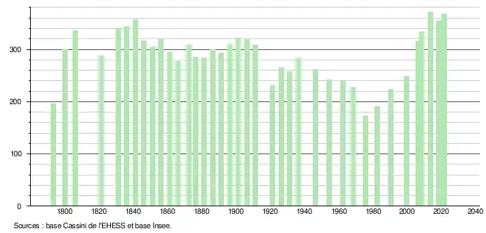 L'évolution du nombre d'habitants est connue à travers les recensements de la population effectués dans la commune depuis 1793. Pour les communes de moins de 10 000 habitants, une enquête de recensement portant sur toute la population est réalisée tous les cinq ans, les populations légales des années intermédiaires étant quant à elles estimées par interpolation ou extrapolation[29]. Pour la commune, le premier recensement exhaustif entrant dans le cadre du nouveau dispositif a été réalisé en 2008[30].