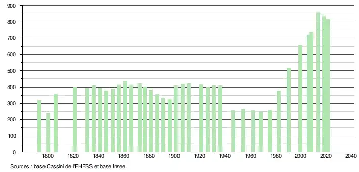 L'évolution du nombre d'habitants est connue à travers les recensements de la population effectués dans la commune depuis 1793. Pour les communes de moins de 10 000 habitants, une enquête de recensement portant sur toute la population est réalisée tous les cinq ans, les populations légales des années intermédiaires étant quant à elles estimées par interpolation ou extrapolation[36]. Pour la commune, le premier recensement exhaustif entrant dans le cadre du nouveau dispositif a été réalisé en 2008[37].