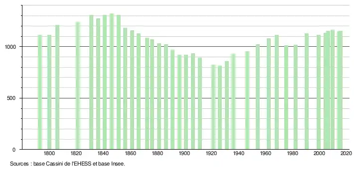 L'évolution du nombre d'habitants est connue à travers les recensements de la population effectués dans la commune depuis 1793. Pour les communes de moins de 10 000 habitants, une enquête de recensement portant sur toute la population est réalisée tous les cinq ans, les populations légales des années intermédiaires étant quant à elles estimées par interpolation ou extrapolation[12]. Pour la commune, le premier recensement exhaustif entrant dans le cadre du nouveau dispositif a été réalisé en 2004[13].