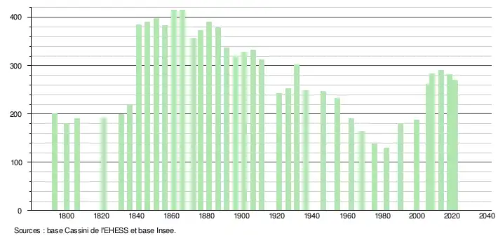 L'évolution du nombre d'habitants est connue à travers les recensements de la population effectués dans la commune depuis 1793. Pour les communes de moins de 10 000 habitants, une enquête de recensement portant sur toute la population est réalisée tous les cinq ans, les populations légales des années intermédiaires étant quant à elles estimées par interpolation ou extrapolation[47]. Pour la commune, le premier recensement exhaustif entrant dans le cadre du nouveau dispositif a été réalisé en 2008[48].