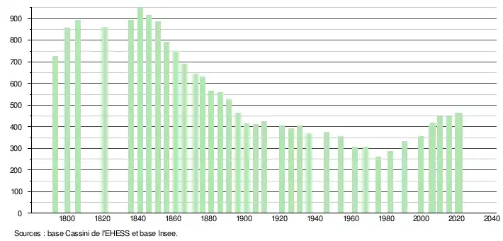 L'évolution du nombre d'habitants est connue à travers les recensements de la population effectués dans la commune depuis 1793. Pour les communes de moins de 10 000 habitants, une enquête de recensement portant sur toute la population est réalisée tous les cinq ans, les populations légales des années intermédiaires étant quant à elles estimées par interpolation ou extrapolation[14]. Pour la commune, le premier recensement exhaustif entrant dans le cadre du nouveau dispositif a été réalisé en 2005[15].