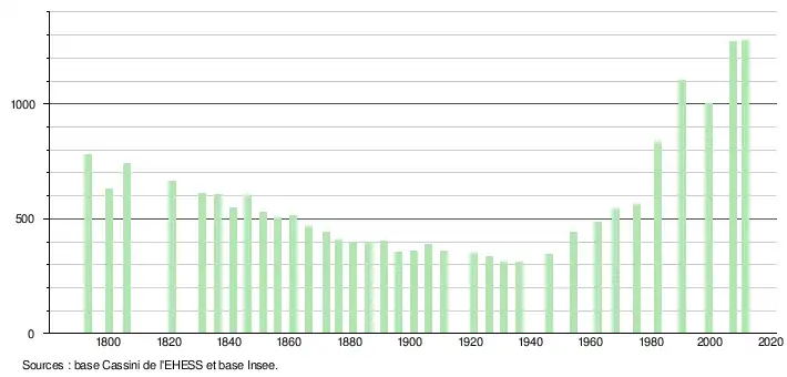 L'évolution du nombre d'habitants est connue à travers les recensements de la population effectués dans la commune depuis 1793. À partir du , les populations légales des communes sont publiées annuellement dans le cadre d'un recensement qui repose désormais sur une collecte d'information annuelle, concernant successivement tous les territoires communaux au cours d'une période de cinq ans. Pour les communes de moins de 10 000 habitants, une enquête de recensement portant sur toute la population est réalisée tous les cinq ans, les populations légales des années intermédiaires étant quant à elles estimées par interpolation ou extrapolation[14]. Pour la commune, le premier recensement exhaustif entrant dans le cadre du nouveau dispositif a été réalisé en 2007[15],[Note 1].