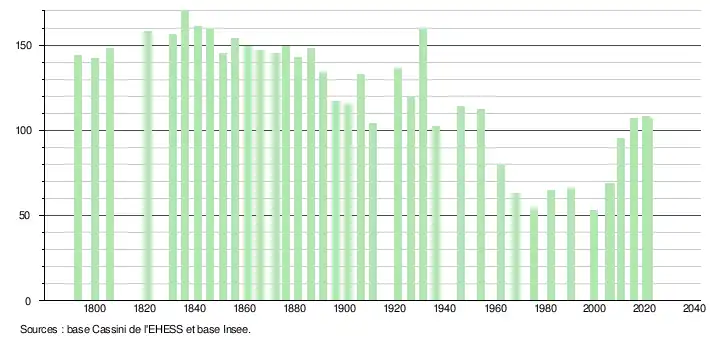 L'évolution du nombre d'habitants est connue à travers les recensements de la population effectués dans la commune depuis 1793. Pour les communes de moins de 10 000 habitants, une enquête de recensement portant sur toute la population est réalisée tous les cinq ans, les populations légales des années intermédiaires étant quant à elles estimées par interpolation ou extrapolation[14]. Pour la commune, le premier recensement exhaustif entrant dans le cadre du nouveau dispositif a été réalisé en 2005[15].