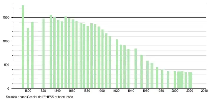 L'évolution du nombre d'habitants est connue à travers les recensements de la population effectués dans la commune depuis 1793. Pour les communes de moins de 10 000 habitants, une enquête de recensement portant sur toute la population est réalisée tous les cinq ans, les populations légales des années intermédiaires étant quant à elles estimées par interpolation ou extrapolation[27]. Pour la commune, le premier recensement exhaustif entrant dans le cadre du nouveau dispositif a été réalisé en 2004[28].