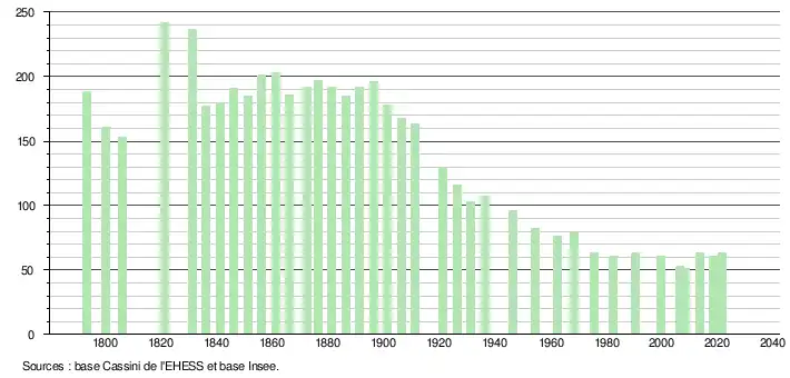 L'évolution du nombre d'habitants est connue à travers les recensements de la population effectués dans la commune depuis 1793. Pour les communes de moins de 10 000 habitants, une enquête de recensement portant sur toute la population est réalisée tous les cinq ans, les populations légales des années intermédiaires étant quant à elles estimées par interpolation ou extrapolation[16]. Pour la commune, le premier recensement exhaustif entrant dans le cadre du nouveau dispositif a été réalisé en 2008[17].
