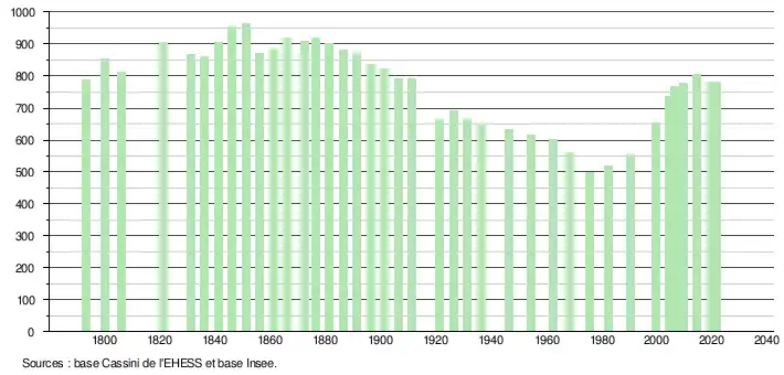 L'évolution du nombre d'habitants est connue à travers les recensements de la population effectués dans la commune depuis 1793. Pour les communes de moins de 10 000 habitants, une enquête de recensement portant sur toute la population est réalisée tous les cinq ans, les populations légales des années intermédiaires étant quant à elles estimées par interpolation ou extrapolation[17]. Pour la commune, le premier recensement exhaustif entrant dans le cadre du nouveau dispositif a été réalisé en 2004[18].