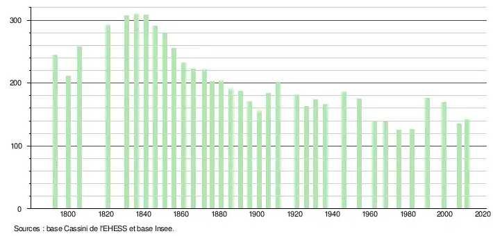 - Dans le tableau des recensements et le graphique, par convention dans Wikipédia, le principe a été retenu, pour les populations légales postérieures à 1999 de n’afficher dans le tableau des recensements et le graphique que les populations correspondant à l'année 2006, première population légale publiée calculée conformément aux concepts définis dans le décret no 2003-485 du 5 juin 2003, et les années correspondant à une enquête exhaustive de recensement pour les communes de moins de 10 000 habitants, ainsi que la dernière population légale publiée par l’Insee.