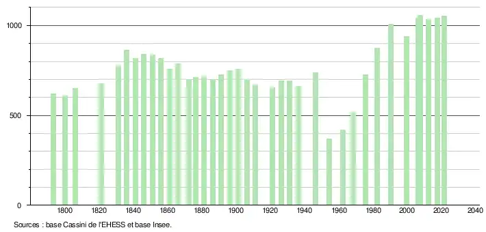 L'évolution du nombre d'habitants est connue à travers les recensements de la population effectués dans la commune depuis 1793. Pour les communes de moins de 10 000 habitants, une enquête de recensement portant sur toute la population est réalisée tous les cinq ans, les populations légales des années intermédiaires étant quant à elles estimées par interpolation ou extrapolation[21]. Pour la commune, le premier recensement exhaustif entrant dans le cadre du nouveau dispositif a été réalisé en 2007[22].