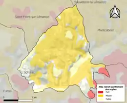 Le retrait-gonflement des sols argileux est susceptible d'engendrer des dommages importants aux bâtiments en cas d’alternance de périodes de sécheresse et de pluie. 70,5 % de la superficie communale est en aléa moyen ou fort (67,7 % au niveau départemental et 48,5 % au niveau national). Sur les 160 bâtiments dénombrés sur la commune en 2019, 78 sont en aléa moyen ou fort, soit 49 %, à comparer aux 72 % au niveau départemental et 54 % au niveau national. Une cartographie de l'exposition du territoire national au retrait gonflement des sols argileux est disponible sur le site du BRGM[21],[Carte 2].