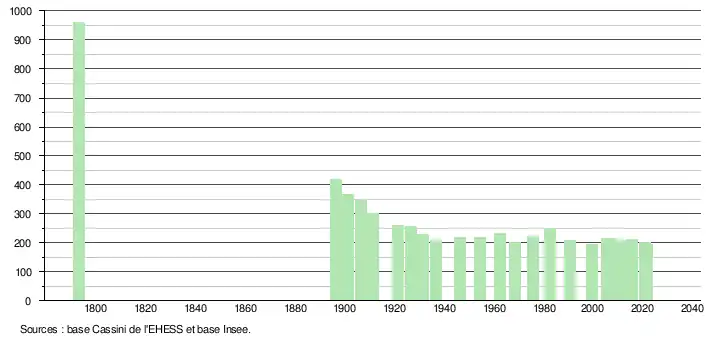 L'évolution du nombre d'habitants est connue à travers les recensements de la population effectués dans la commune depuis 1793. Pour les communes de moins de 10 000 habitants, une enquête de recensement portant sur toute la population est réalisée tous les cinq ans, les populations légales des années intermédiaires étant quant à elles estimées par interpolation ou extrapolation[26]. Pour la commune, le premier recensement exhaustif entrant dans le cadre du nouveau dispositif a été réalisé en 2005[27].