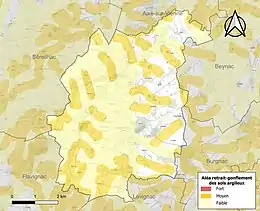Le retrait-gonflement des sols argileux est susceptible d'engendrer des dommages importants aux bâtiments en cas d’alternance de périodes de sécheresse et de pluie[17]. 32,9 % de la superficie communale est en aléa moyen ou fort (27 % au niveau départemental et 48,5 % au niveau national métropolitain)[Carte 2]. Depuis le , en application de la loi ÉLAN, différentes contraintes s'imposent aux vendeurs, maîtres d'ouvrages ou constructeurs de biens situés dans une zone classée en aléa moyen ou fort[Note 3],[18].