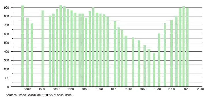 L'évolution du nombre d'habitants est connue à travers les recensements de la population effectués dans la commune depuis 1793. Pour les communes de moins de 10 000 habitants, une enquête de recensement portant sur toute la population est réalisée tous les cinq ans, les populations légales des années intermédiaires étant quant à elles estimées par interpolation ou extrapolation[22]. Pour la commune, le premier recensement exhaustif entrant dans le cadre du nouveau dispositif a été réalisé en 2006[23].