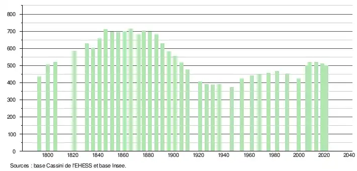 L'évolution du nombre d'habitants est connue à travers les recensements de la population effectués dans la commune depuis 1793. Pour les communes de moins de 10 000 habitants, une enquête de recensement portant sur toute la population est réalisée tous les cinq ans, les populations légales des années intermédiaires étant quant à elles estimées par interpolation ou extrapolation[21]. Pour la commune, le premier recensement exhaustif entrant dans le cadre du nouveau dispositif a été réalisé en 2008[22].