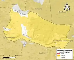 Le retrait-gonflement des sols argileux est susceptible d'engendrer des dommages importants aux bâtiments en cas d’alternance de périodes de sécheresse et de pluie. 93,7 % de la superficie communale est en aléa moyen ou fort (67,4 % au niveau départemental et 48,5 % au niveau national). Sur les 215 bâtiments dénombrés sur la commune en 2019, 188 sont en aléa moyen ou fort, soit 87 %, à comparer aux 81 % au niveau départemental et 54 % au niveau national. Une cartographie de l'exposition du territoire national au retrait gonflement des sols argileux est disponible sur le site du BRGM[20],[Carte 3].