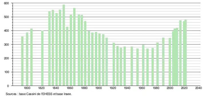 L'évolution du nombre d'habitants est connue à travers les recensements de la population effectués dans la commune depuis 1793. Pour les communes de moins de 10 000 habitants, une enquête de recensement portant sur toute la population est réalisée tous les cinq ans, les populations légales des années intermédiaires étant quant à elles estimées par interpolation ou extrapolation[20]. Pour la commune, le premier recensement exhaustif entrant dans le cadre du nouveau dispositif a été réalisé en 2004[21].
