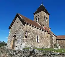- l'église Saint-Denis, d'origine romane mais en grande partie reconstruite à la fin du XVe siècle ou au début du siècle suivant (avec un clocher initialement construit au-dessus du chœur mais qui fut démoli au milieu du XIXe siècle pour être remplacé par un clocher-porche), édifice consacré du diocèse d'Autun relevant de la paroisse Notre-Dame-des-Coteaux-en-Mâconnais (Lugny)[24] ;