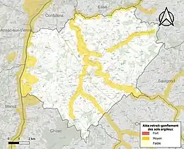 Le retrait-gonflement des sols argileux est susceptible d'engendrer des dommages importants aux bâtiments en cas d’alternance de périodes de sécheresse et de pluie. 17,9 % de la superficie communale est en aléa moyen ou fort (67,4 % au niveau départemental et 48,5 % au niveau national). Sur les 578 bâtiments dénombrés sur la commune en 2019, 71 sont en aléa moyen ou fort, soit 12 %, à comparer aux 81 % au niveau départemental et 54 % au niveau national. Une cartographie de l'exposition du territoire national au retrait gonflement des sols argileux est disponible sur le site du BRGM[21],[Carte 3].
