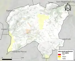 Le retrait-gonflement des sols argileux est susceptible d'engendrer des dommages importants aux bâtiments en cas d’alternance de périodes de sécheresse et de pluie. 0 % de la superficie communale est en aléa moyen ou fort (67,7 % au niveau départemental et 48,5 % au niveau national). Sur les 137 bâtiments dénombrés sur la commune en 2019, 0 sont en aléa moyen ou fort, soit 0 %, à comparer aux 72 % au niveau départemental et 54 % au niveau national. Une cartographie de l'exposition du territoire national au retrait gonflement des sols argileux est disponible sur le site du BRGM[25],[Carte 2].