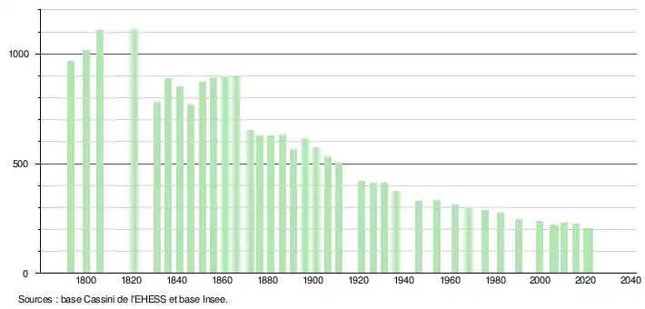L'évolution du nombre d'habitants est connue à travers les recensements de la population effectués dans la commune depuis 1793. Pour les communes de moins de 10 000 habitants, une enquête de recensement portant sur toute la population est réalisée tous les cinq ans, les populations légales des années intermédiaires étant quant à elles estimées par interpolation ou extrapolation[29]. Pour la commune, le premier recensement exhaustif entrant dans le cadre du nouveau dispositif a été réalisé en 2005[30].