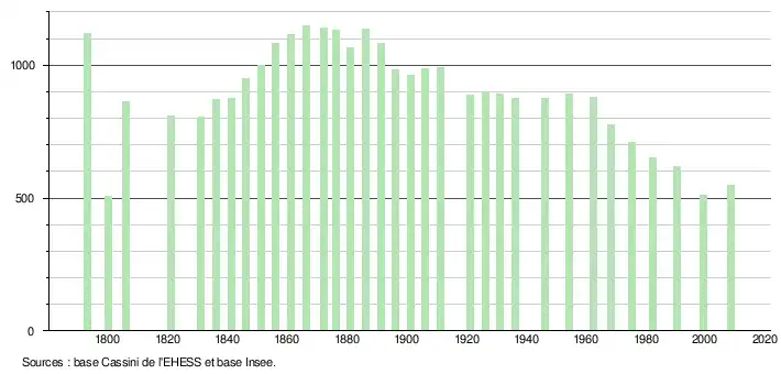 L'évolution du nombre d'habitants est connue à travers les recensements de la population effectués dans la commune depuis 1793. À partir du , les populations légales des communes sont publiées annuellement dans le cadre d'un recensement qui repose désormais sur une collecte d'information annuelle, concernant successivement tous les territoires communaux au cours d'une période de cinq ans. Pour les communes de moins de 10 000 habitants, une enquête de recensement portant sur toute la population est réalisée tous les cinq ans, les populations légales des années intermédiaires étant quant à elles estimées par interpolation ou extrapolation[2]. Pour la commune, le premier recensement exhaustif entrant dans le cadre du nouveau dispositif a été réalisé en 2008[3],[Note 1].