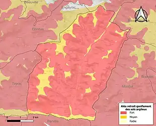 Le retrait-gonflement des sols argileux est susceptible d'engendrer des dommages importants aux bâtiments en cas d’alternance de périodes de sécheresse et de pluie[20]. La totalité de la commune est en aléa moyen ou fort (91,8 % au niveau départemental et 48,5 % au niveau national)[Carte 2]. Depuis le , en application de la loi ELAN, différentes contraintes s'imposent aux vendeurs, maîtres d'ouvrages ou constructeurs de biens situés dans une zone classée en aléa moyen ou fort[Note 3],[21].