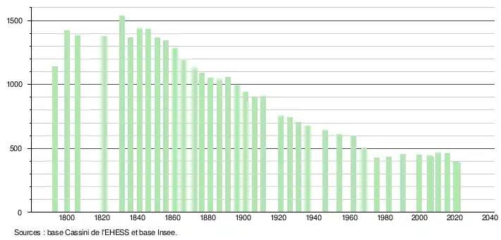 L'évolution du nombre d'habitants est connue à travers les recensements de la population effectués dans la commune depuis 1793. Pour les communes de moins de 10 000 habitants, une enquête de recensement portant sur toute la population est réalisée tous les cinq ans, les populations légales des années intermédiaires étant quant à elles estimées par interpolation ou extrapolation[26]. Pour la commune, le premier recensement exhaustif entrant dans le cadre du nouveau dispositif a été réalisé en 2005[27].