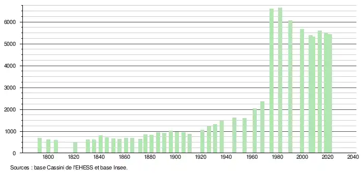 L'évolution du nombre d'habitants est connue à travers les recensements de la population effectués dans la commune depuis 1793. Pour les communes de moins de 10 000 habitants, une enquête de recensement portant sur toute la population est réalisée tous les cinq ans, les populations légales des années intermédiaires étant quant à elles estimées par interpolation ou extrapolation[24]. Pour la commune, le premier recensement exhaustif entrant dans le cadre du nouveau dispositif a été réalisé en 2008[25].