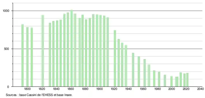 L'évolution du nombre d'habitants est connue à travers les recensements de la population effectués dans la commune depuis 1793. Pour les communes de moins de 10 000 habitants, une enquête de recensement portant sur toute la population est réalisée tous les cinq ans, les populations légales des années intermédiaires étant quant à elles estimées par interpolation ou extrapolation[22]. Pour la commune, le premier recensement exhaustif entrant dans le cadre du nouveau dispositif a été réalisé en 2007[23].