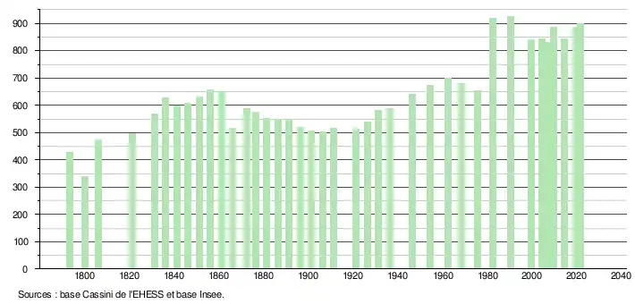 L'évolution du nombre d'habitants est connue à travers les recensements de la population effectués dans la commune depuis 1793. Pour les communes de moins de 10 000 habitants, une enquête de recensement portant sur toute la population est réalisée tous les cinq ans, les populations légales des années intermédiaires étant quant à elles estimées par interpolation ou extrapolation[25]. Pour la commune, le premier recensement exhaustif entrant dans le cadre du nouveau dispositif a été réalisé en 2004[26].
