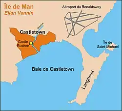 Carte de la péninsule de Langness, de l'île Saint-Michael, de l'aéroport du Ronaldsway et de Castletown