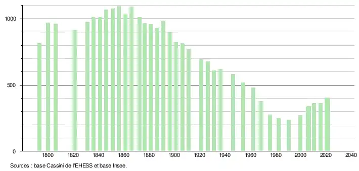 L'évolution du nombre d'habitants est connue à travers les recensements de la population effectués dans la commune depuis 1793. Pour les communes de moins de 10 000 habitants, une enquête de recensement portant sur toute la population est réalisée tous les cinq ans, les populations légales des années intermédiaires étant quant à elles estimées par interpolation ou extrapolation[18]. Pour la commune, le premier recensement exhaustif entrant dans le cadre du nouveau dispositif a été réalisé en 2005[19].