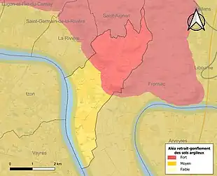 Le retrait-gonflement des sols argileux est susceptible d'engendrer des dommages importants aux bâtiments en cas d’alternance de périodes de sécheresse et de pluie. 92,8 % de la superficie communale est en aléa moyen ou fort (67,4 % au niveau départemental et 48,5 % au niveau national). Sur les 262 bâtiments dénombrés sur la commune en 2019, 262 sont en aléa moyen ou fort, soit 100 %, à comparer aux 84 % au niveau départemental et 54 % au niveau national. Une cartographie de l'exposition du territoire national au retrait gonflement des sols argileux est disponible sur le site du BRGM[29],[Carte 2].