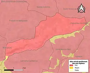 Le retrait-gonflement des sols argileux est susceptible d'engendrer des dommages importants aux bâtiments en cas d’alternance de périodes de sécheresse et de pluie. La totalité de la commune est en aléa moyen ou fort (67,4 % au niveau départemental et 48,5 % au niveau national). Sur les 109 bâtiments dénombrés sur la commune en 2019, 109 sont en aléa moyen ou fort, soit 100 %, à comparer aux 84 % au niveau départemental et 54 % au niveau national. Une cartographie de l'exposition du territoire national au retrait gonflement des sols argileux est disponible sur le site du BRGM[20],[Carte 2].