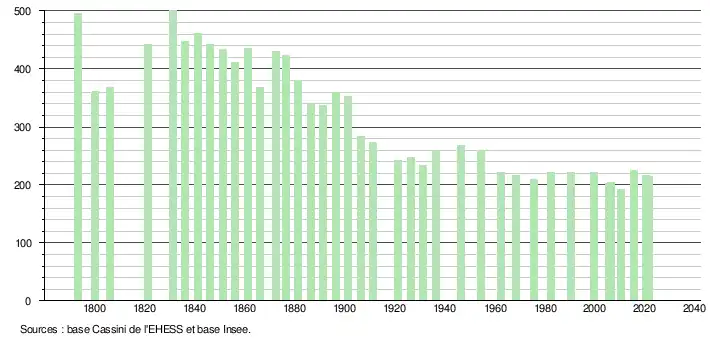 L'évolution du nombre d'habitants est connue à travers les recensements de la population effectués dans la commune depuis 1793. Pour les communes de moins de 10 000 habitants, une enquête de recensement portant sur toute la population est réalisée tous les cinq ans, les populations légales des années intermédiaires étant quant à elles estimées par interpolation ou extrapolation[23]. Pour la commune, le premier recensement exhaustif entrant dans le cadre du nouveau dispositif a été réalisé en 2005[24].