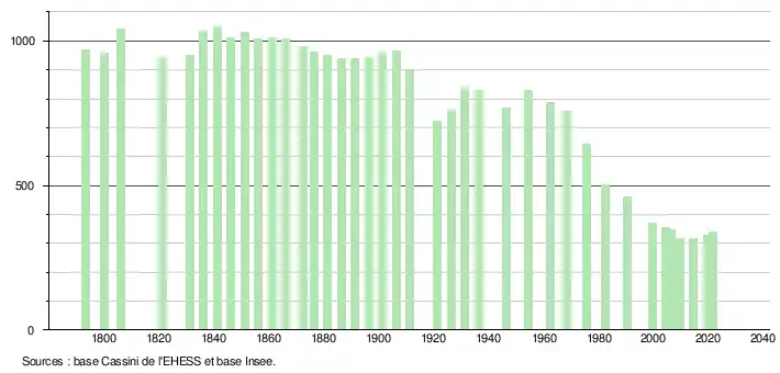 L'évolution du nombre d'habitants est connue à travers les recensements de la population effectués dans la commune depuis 1793. Pour les communes de moins de 10 000 habitants, une enquête de recensement portant sur toute la population est réalisée tous les cinq ans, les populations légales des années intermédiaires étant quant à elles estimées par interpolation ou extrapolation[23]. Pour la commune, le premier recensement exhaustif entrant dans le cadre du nouveau dispositif a été réalisé en 2004[24].