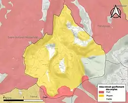 La commune est vulnérable au risque de mouvements de terrains constitué principalement du retrait-gonflement des sols argileux[24]. Cet aléa est susceptible d'engendrer des dommages importants aux bâtiments en cas d’alternance de périodes de sécheresse et de pluie. 80,6 % de la superficie communale est en aléa moyen ou fort (76,3 % au niveau départemental et 48,5 % au niveau national). Sur les 63 bâtiments dénombrés sur la commune en 2019, 40 sont en aléa moyen ou fort, soit 63 %, à comparer aux 90 % au niveau départemental et 54 % au niveau national. Une cartographie de l'exposition du territoire national au retrait gonflement des sols argileux est disponible sur le site du BRGM[25],[Carte 3].